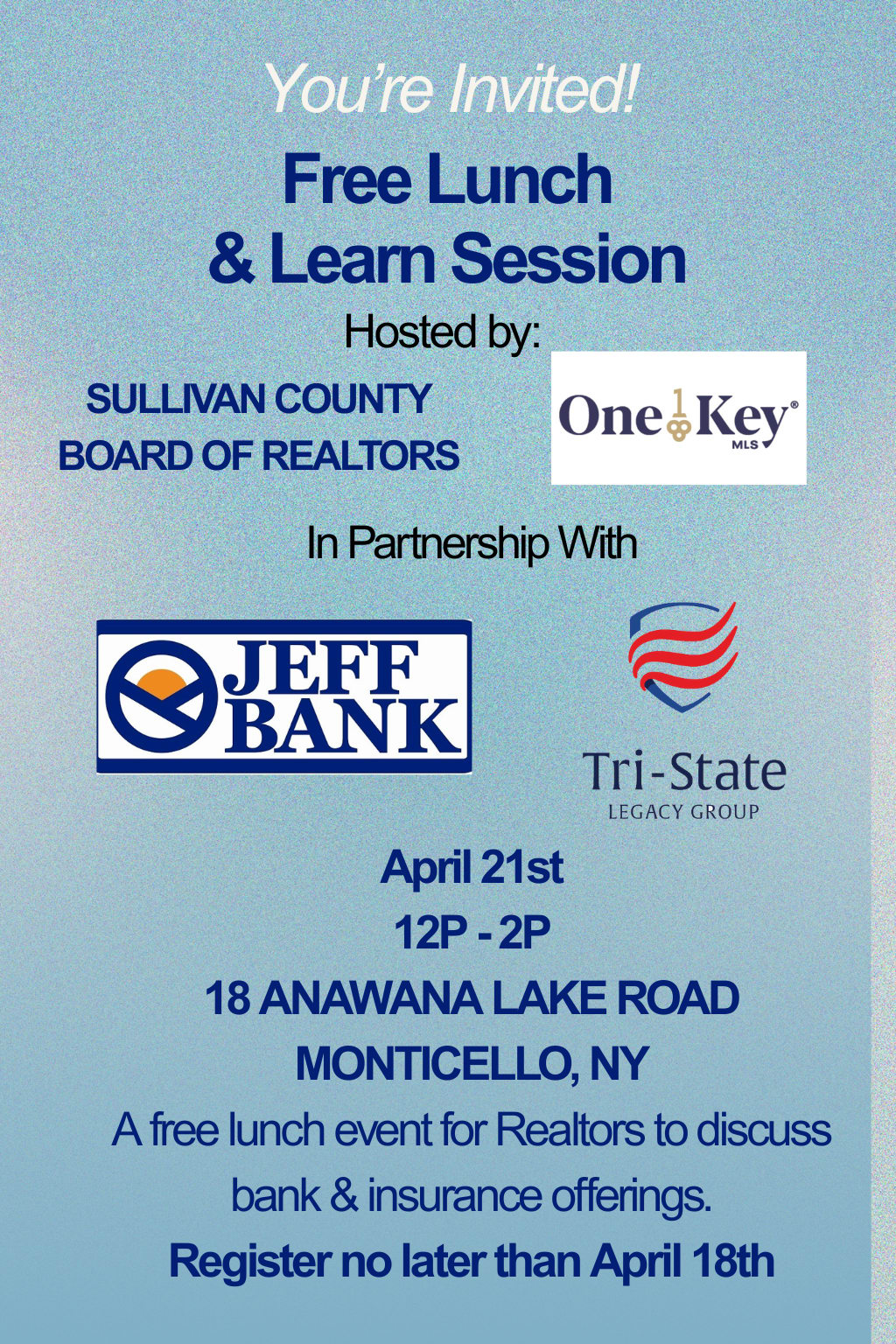 Please join the Sullivan County Board of Realtors for a Lunch & Learn event being held on Tuesday, April 21st at Jeff Bank located at 18 Anawana Lake Road in Monticello to learn about banking and insurance opportunities! Please register ahead of time no later than April 18th. This event is being sponsored by Jeff Bank, Tri-State Legacy Group and OneKey MLS.